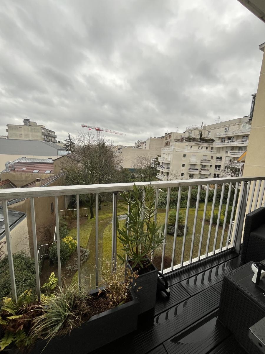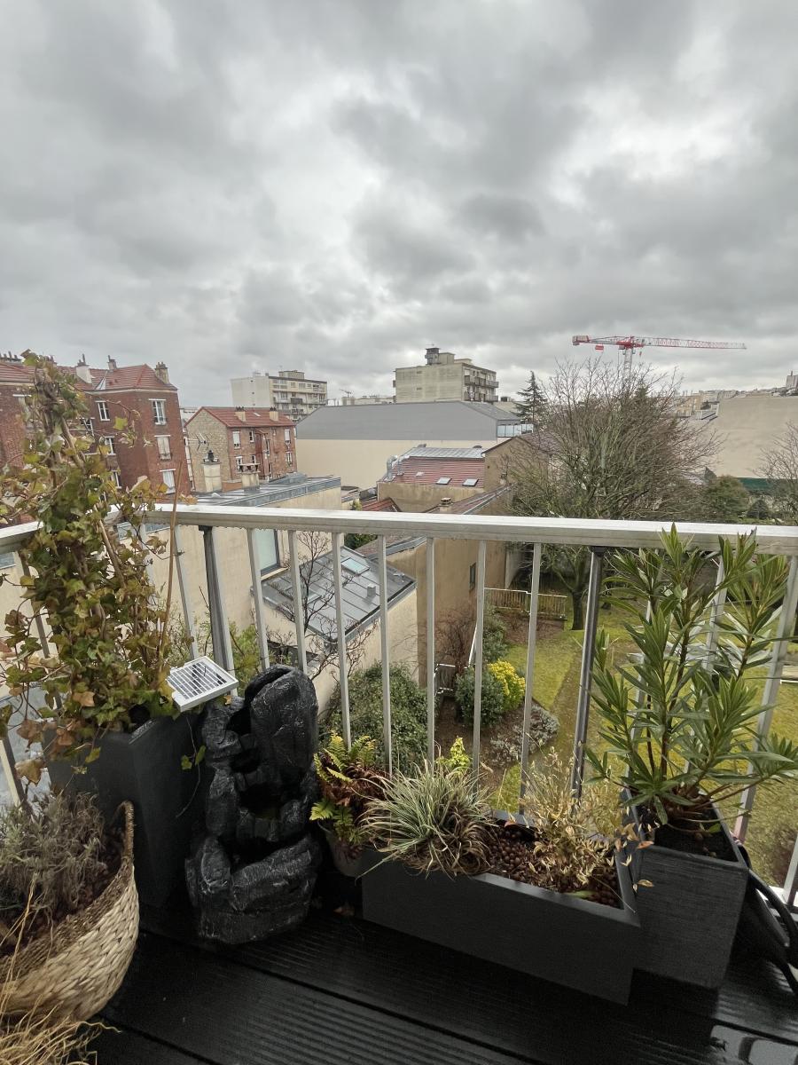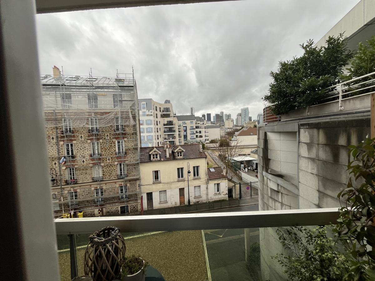 Le balcon des chambres donne sur l'arrière du bâtiment sur des jardins, le balcon du séjour donne sur la rue.